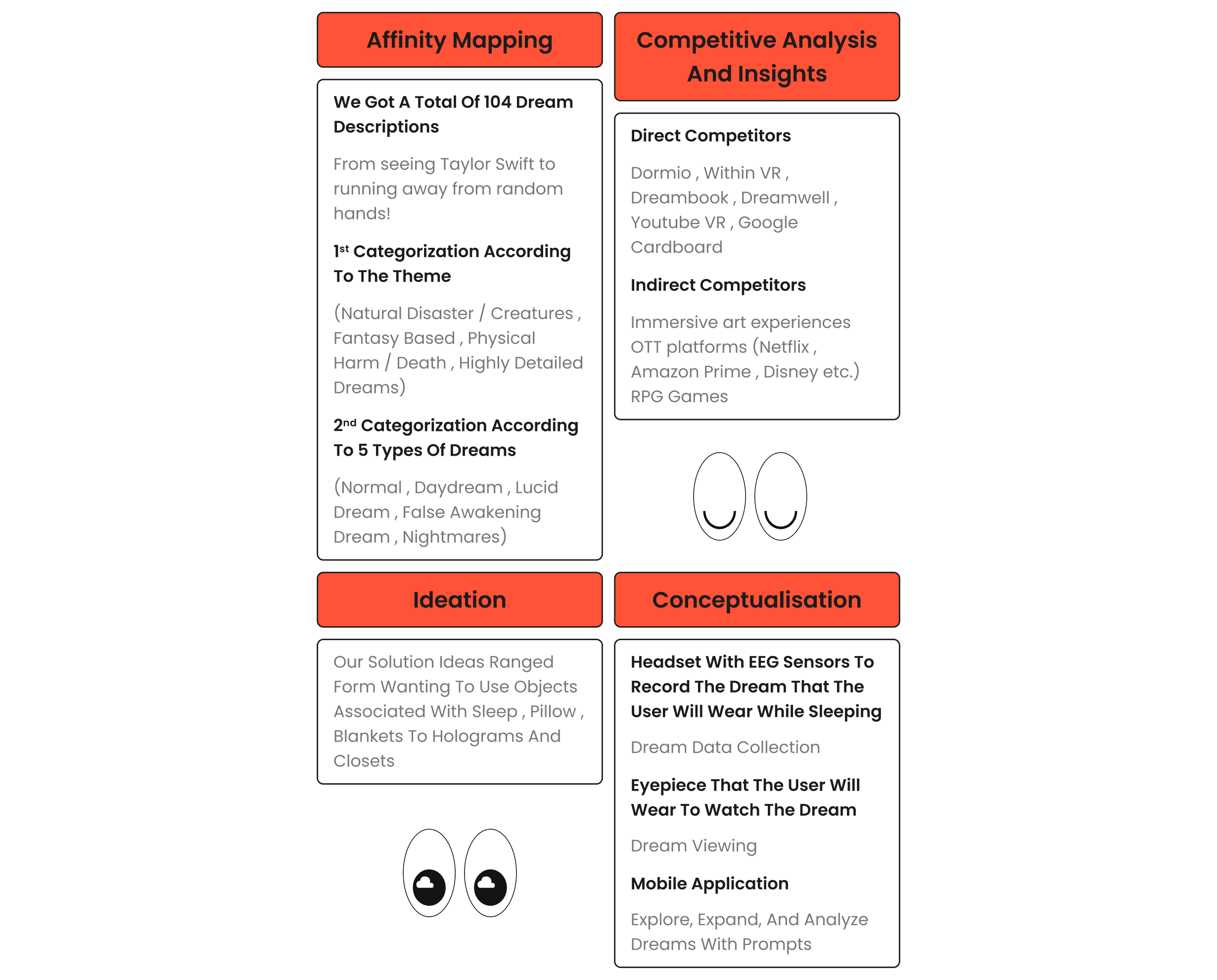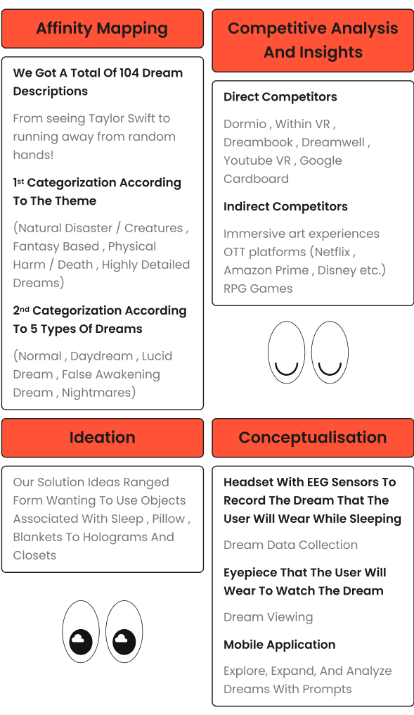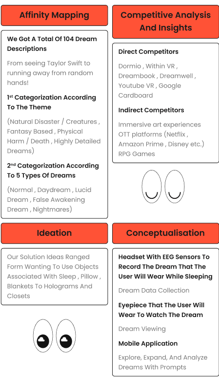 Utilizing innovative technology, dream types are identified via their electrical signatures , enhanced by dream journaling for added authenticity. Language processing, image and video algorithms offer personalized experiences, while 3D animated models amplify visual impact. The physical assembly process of the DC Headgear adds personalization.
