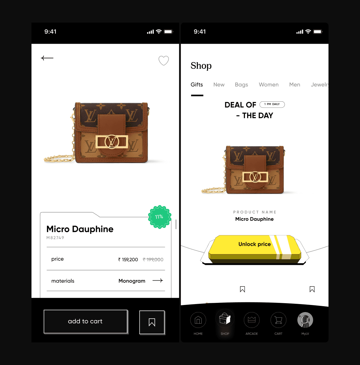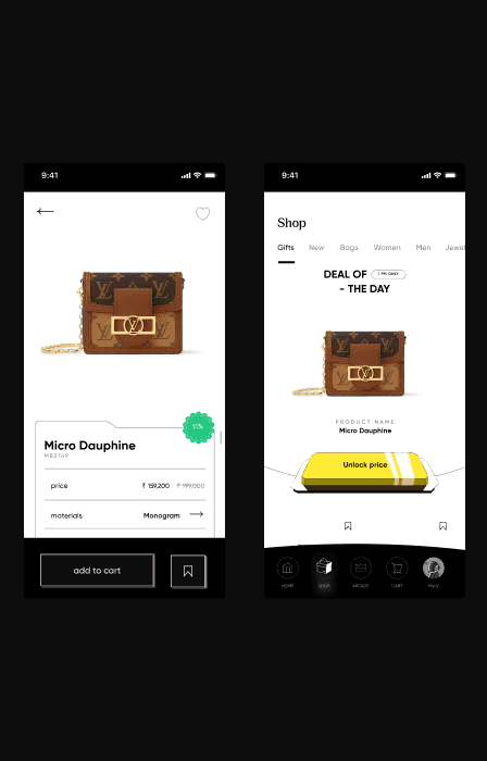 The Home and the Shop screens seamlessly combine the content strategy of the original LV app with added emphasis on incorporating the motion graphics so central to the CRED app. I crafted these animations borrowing from the movements of what CRED has and applied them to the context of a luxury eCommerce app , customizing illustrations