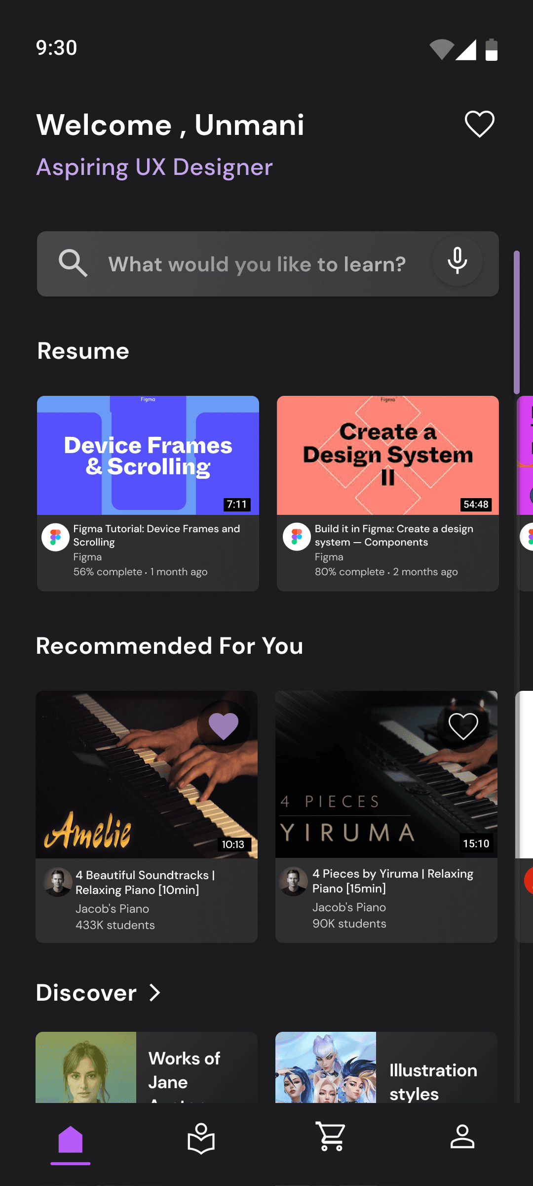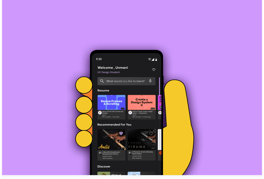 In the original design, a significant portion of screen space was dedicated to showcasing deals, which, while informative about new opportunities, obscured courses in progress for returning users, requiring additional scrolling. This introduced an unnecessary barrier between users and their ongoing courses, potentially delaying the gratification of completion and the genuine value derived from Udemy. Addressing this concern, the redesign prioritizes course resumption for returning users, followed by personalized recommendations based on onboarding data or search history for new users, as well as past completed courses. The discovery section highlights new course offerings, with recommendations and discovery serving as subtle advertisements, recognizing that information about deals can be more effectively communicated through alternative channels like social media.