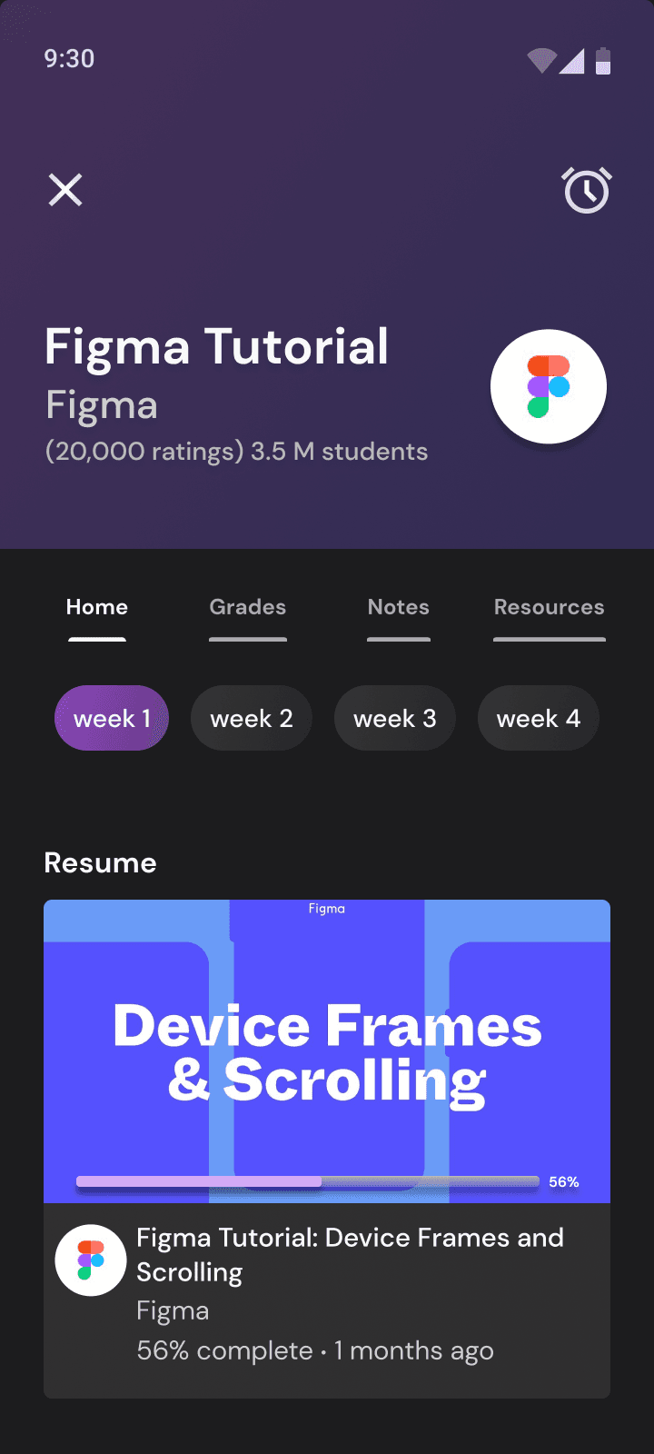 The course content is structured week by week, complemented by features such as Grades, Notes, and Resources arranged as distinct tabs. Furthermore, returning users have the convenient option of resuming their tasks seamlessly, with incomplete or upcoming tasks prioritized at the forefront, aiming to alleviate cognitive strain and streamline the course completion journey.